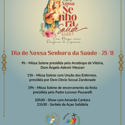 O ponto alto da programação será no dia 21 de novembro, com Missa Solene às 9h, celebrada pelo Arcebispo de Vitória, Dom Ângelo Ademir Mezzari; às 15h, a Missa com o sacramento da Unção dos Enfermos e, às 19h a Missa de encerramento dos festejos, seguido do show da Amanda Cantora e o sorteio da Ação Solidária.